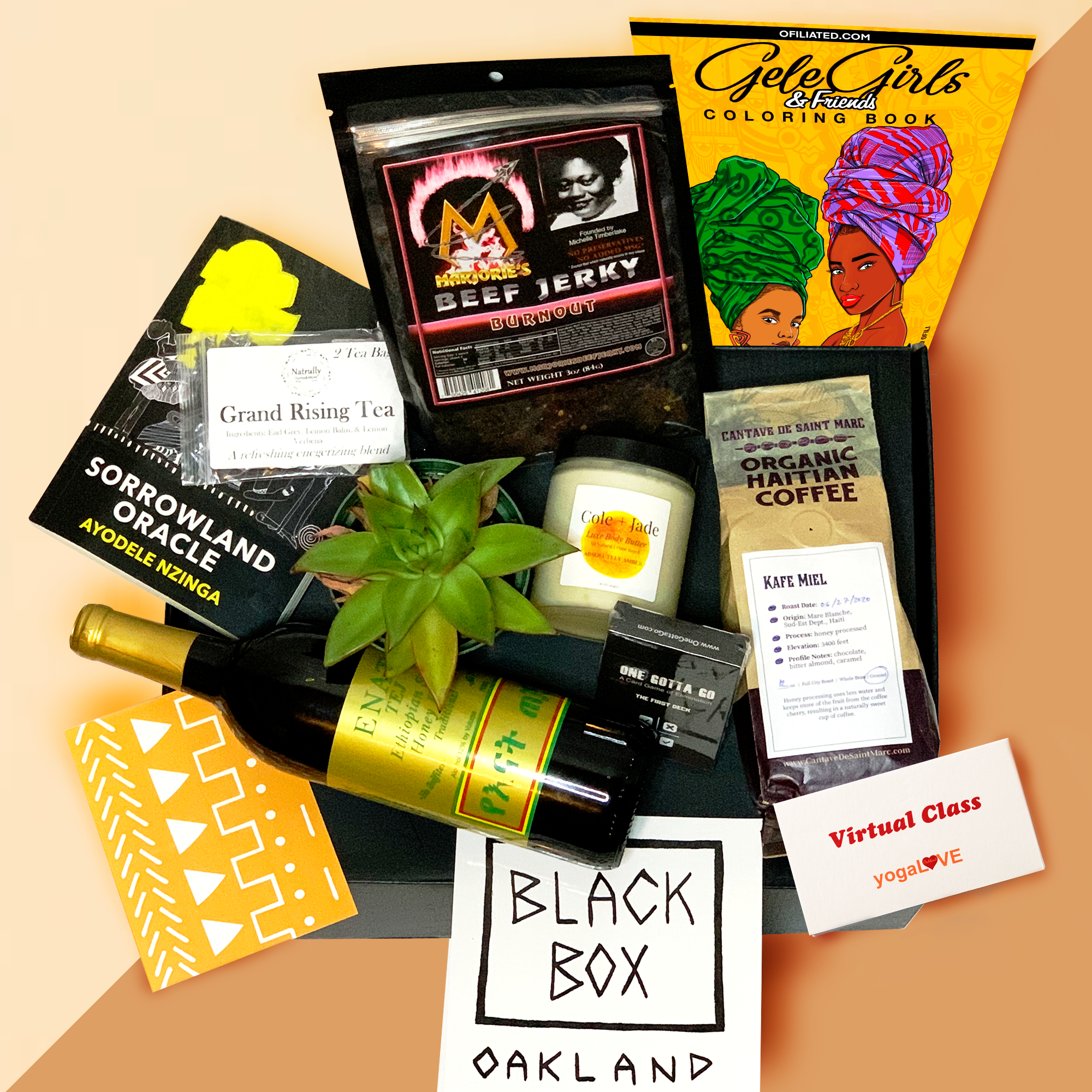 Black Box-Oakland [𝐒𝐢𝐭-𝐈𝐧 + 𝐂𝐨𝐦𝐦𝐮𝐧𝐢𝐭𝐲 𝐂𝐚𝐫𝐞] $130 Another Black Box from Afro Urban Society, this one encourages you to bring others into the mix, because Care for yourself needs other help. Nails Pro Box Manicure Set , Naturally Herbs & More Digital Detox Blend Tea Blend , Hella Charged & LIT: Beja Candle: Coconut wax, paraffin-free, clean-burning , Cole & Jade Face Cream , So Brash Castile Oil Body Wash , Cantave de Saint-Marc Organic Haitian Coffee , Brandon Spices Berbere Spice Pack , Marjorie's Beef Jerky , Enat Winery Traditional Honey Wine , Ofili Designs Gele Girl w/ Friends Coloring Book , One Gotta Go The First Deck: Digital Card Game , Yoga Love Online Yoga Class , Ayodele Nzinga Sorrowland Oracle , Long Hair Plant Care Baby Succulent Plant